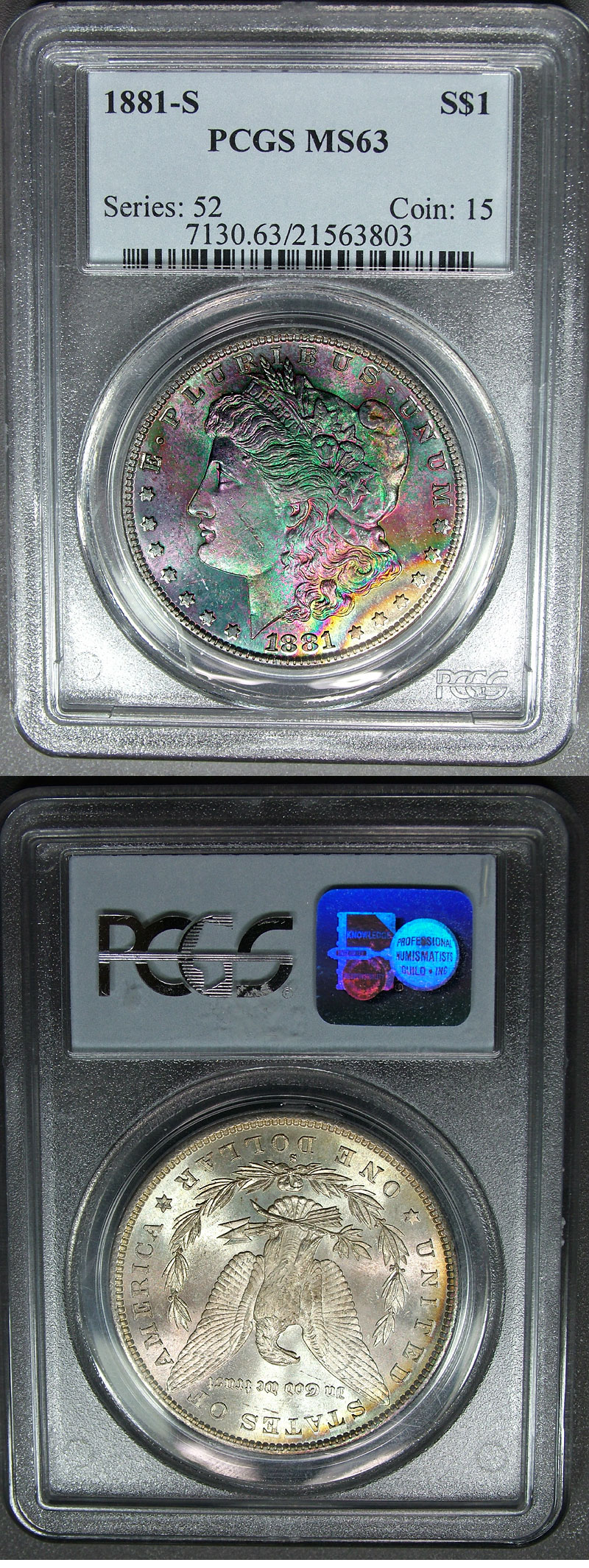 1881-S PCGS MS63 Emerald Magenta Rainbow Toned Morgan