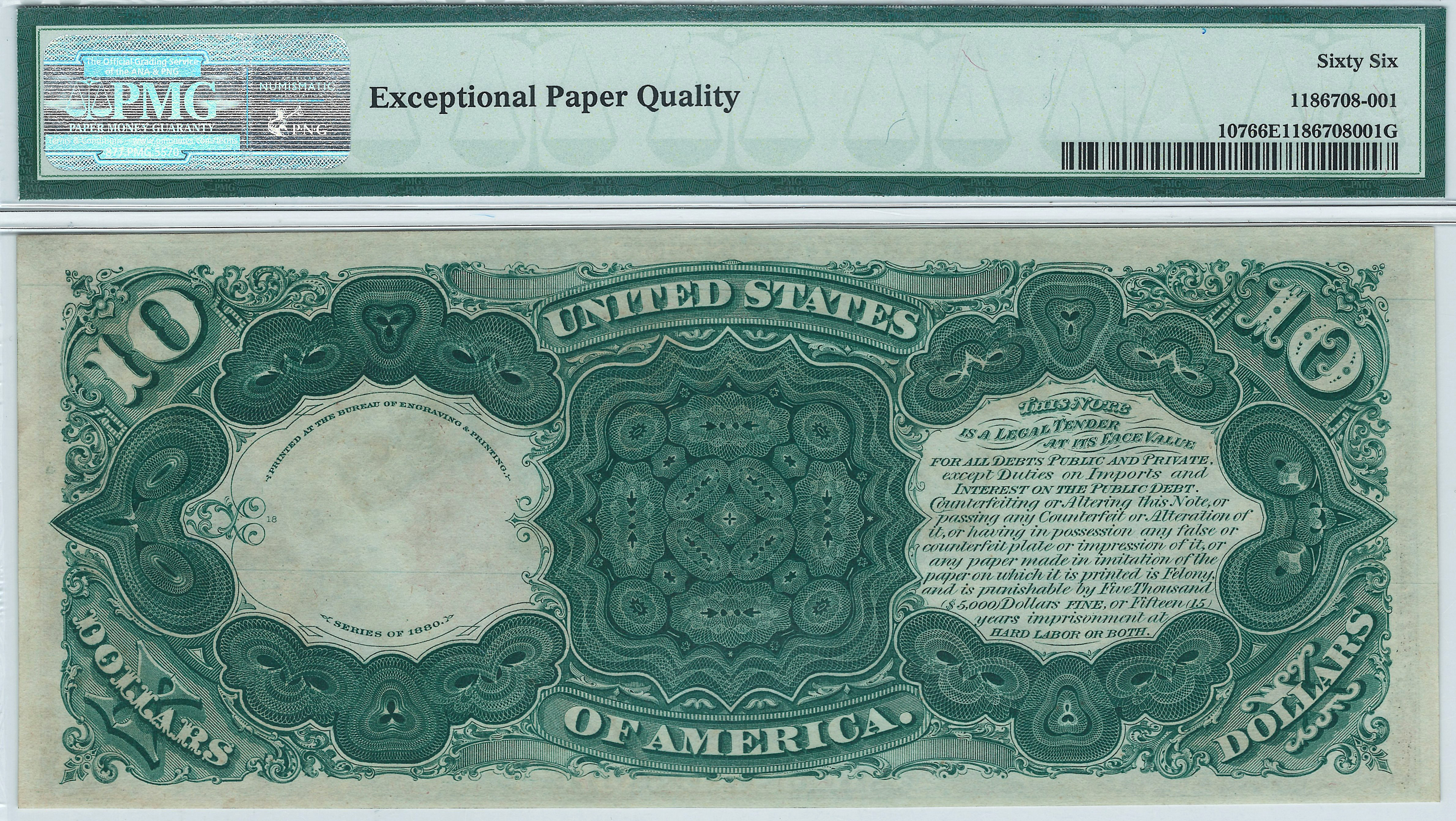 This 1880 $10 Legal Tender features the large red spiked seal with deep dark blue serial numbers. On the left is the head of Daniel Webster, Secretary of State in 1841 and from 1850-1852. On the right is Indian Princess Pocahontas being presented to England’s Royal Court. This is the also sometimes referred to as the famous Jackass Note because the Eagle at the bottom of the note looks like the head of a Jackass when the note is held upside down. This is one of the finest Jackass notes you will see anywhere. The serial number is A6670950 and is in a PMG-66EPQ holder. This will end up in a collection that requires only the finest.