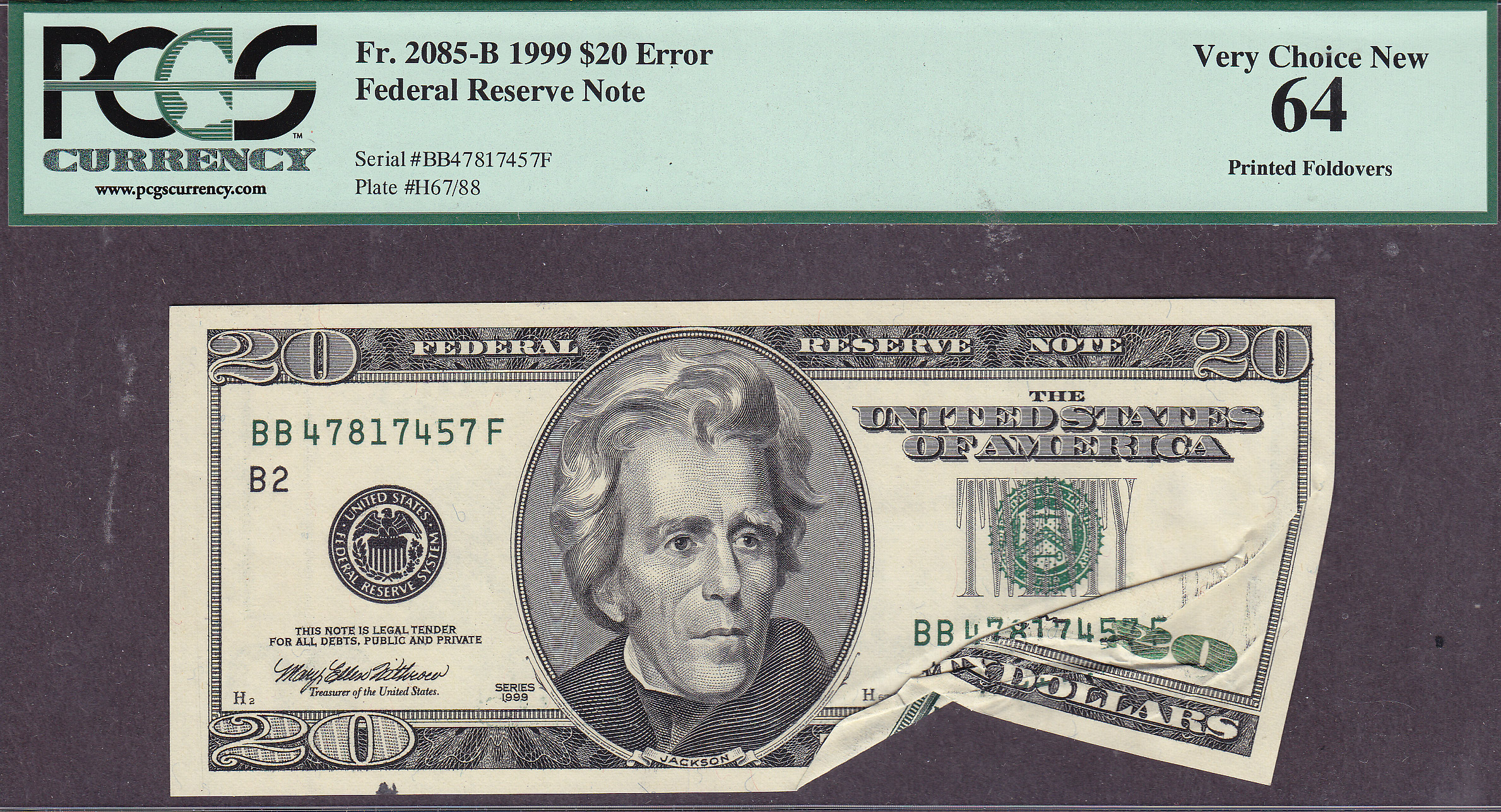 It got crushed! This is one of the most dramatic errors I own. It is a 1999 $20 FRN with the crushed serial number of BB47817457F. What make this so special is the note was crushed before the third printing and the serial numbers printed over the top of the crushed bill. I have never seen this before and I have bought and sold thousands of large size and small size errors but his is the first one of this type I have owned. I bought this note in 2002 from Steve Sullivan, author of the book on small size error notes. Its totally dramatic with lots of eye appeal as a dramatic error. It is in a PCGS-64 holder. I don not care what PCGS says this note is totaly original in every way as you will see when you get it.