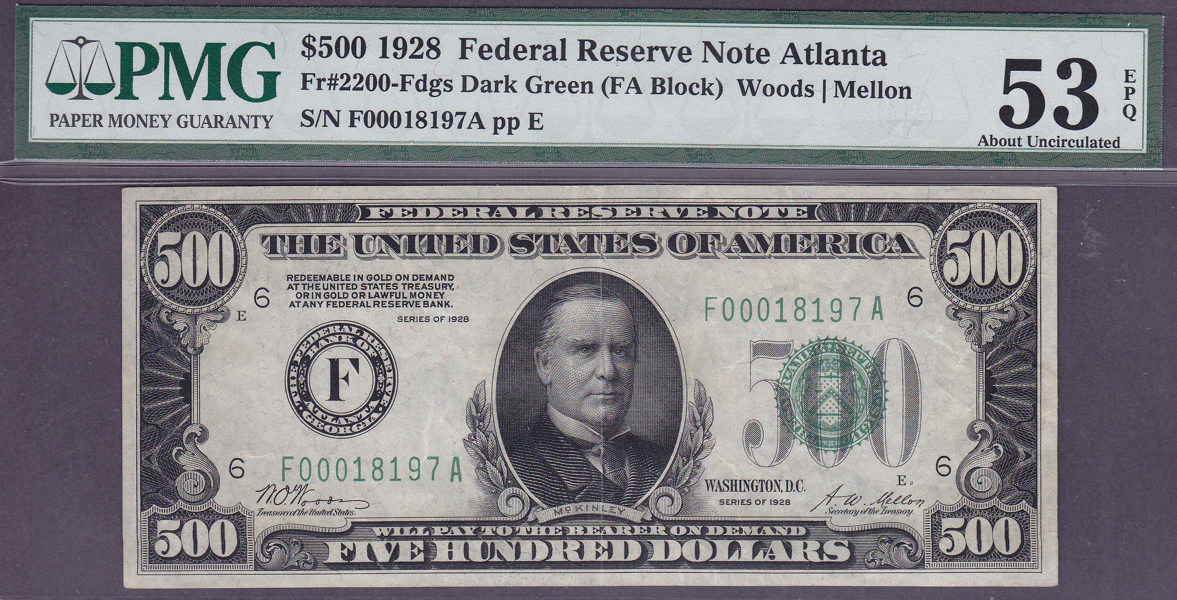 This is a very nice 1928 Atlanta $500 FRN with the serial number of F00018197A and is in a PMG-AU 53EPQ holder. Atlanta is a very hard district for any 1928 $500 or $1000. This beauty is totally original with no issues of any kind. It is a couple of slight folds away from a $20K GEM-65EPQ note because of its even margins. The last record of a 1928 $500 EPQ Atlanta that sold was a PMG-66EPQ and it was sold by Heritage January 10, 2015 for $28,200.