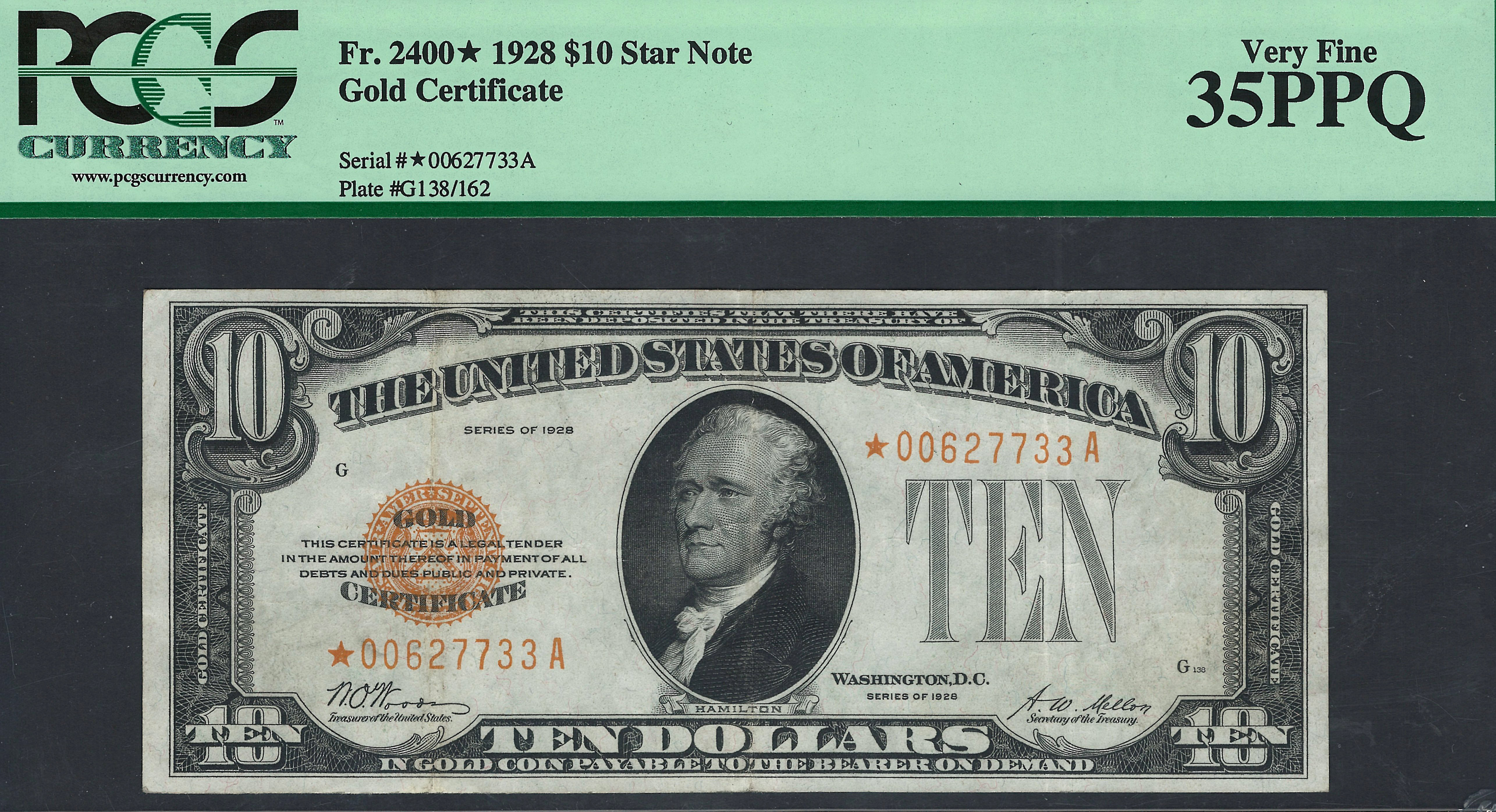 Fr.-2400 1928 $10 Gold Cert STAR Ser. 00627733A PCGS VF-35PPQ