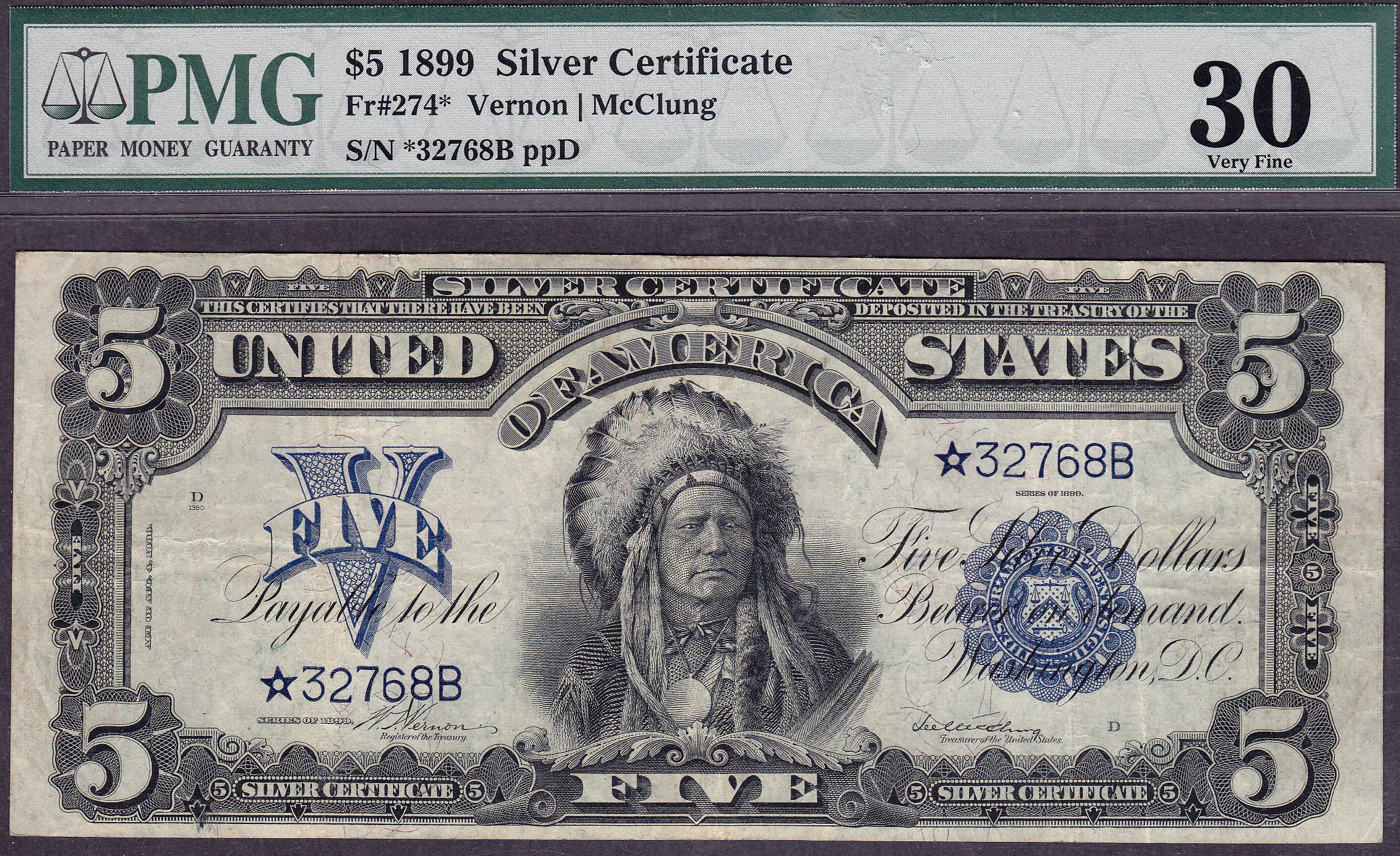 PMG POP2/ 1 Finer! ONLY 10 KNOWN! This is one of the finest and rarest Large Size 1899 $5 Chief star notes available. It is also in superb condition as far as Chief star notes go. Most of them are in VF to Fine condition. Any 1899 $5 Silver Certificate Chief star is very rare and collectible, in any grade. Not many of these stars show up anywhere as collectors need them for type notes, The Fr.-274 Star is one of the key star notes of all the Chief Stars. And this is one of the finest.