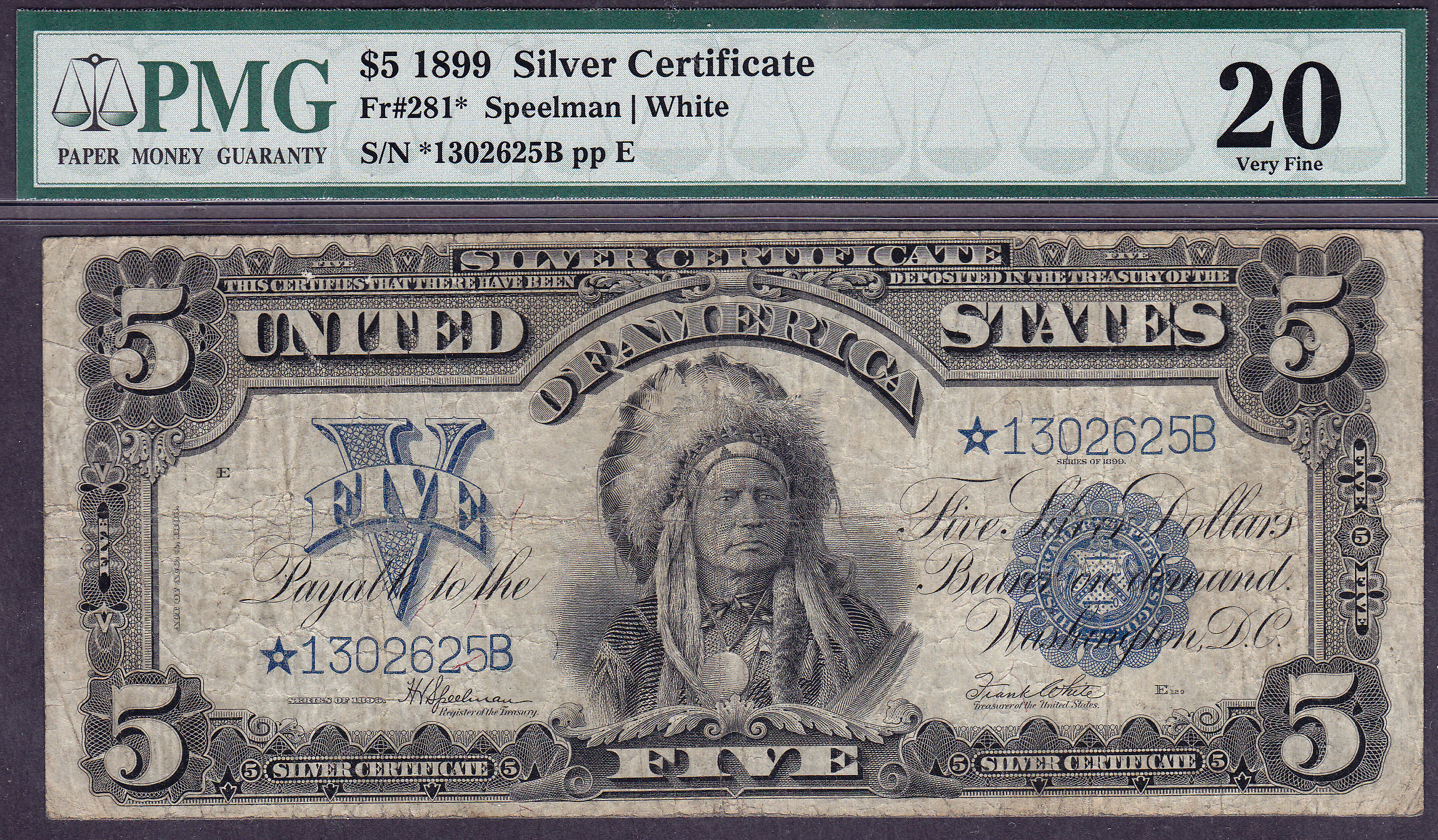 ONLY 7 KNOWN TO EXIST!!! The 1899 $5 Chief star note,FR-279* is the Second Finest Known and rarest of all Chief star notes with only 7 known. The Chief Fr-274* has only 4 known. This FR-279* Chief star note is the 3rd finest of the 7 known. The serial number is *1302625B and it is graded as a PMG VF-20. This is the only one I have. The Murray Large Size star book list this note a t $3700 in VG-F and $5500 in VF. This is a cheap price for a star with only 7 known. I wish it was a coin!