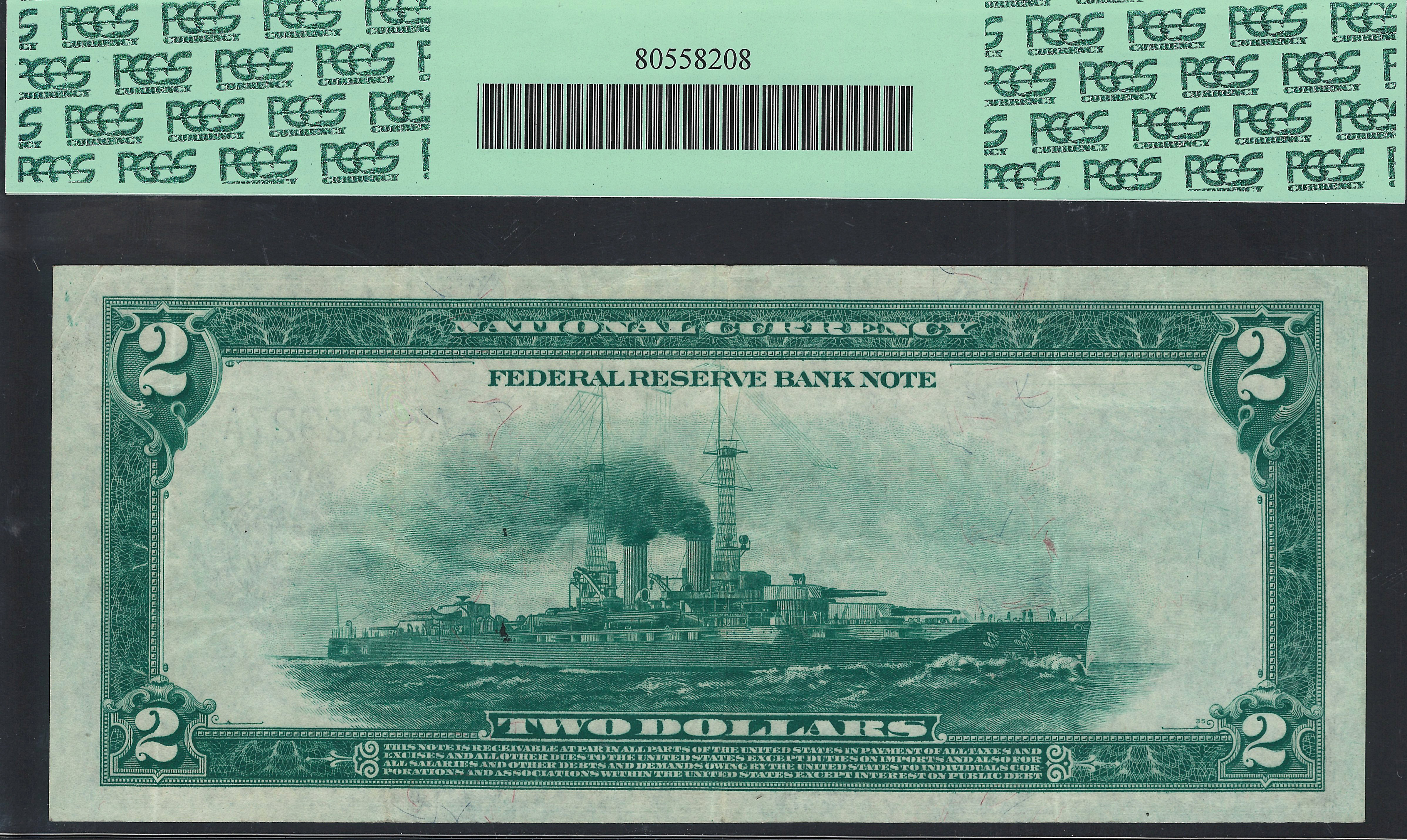 This is a very nice 1918 $2 Boston Battleship in a PCGS-35EPQ holder. the reason I purchase this not is because it is difficult to find a nice clean midgrade Battleship that has never been doctored or cleaned and pressed. The serial number is A3852927 and it resides in a PCGS VF-35 PPQ holder. Most of these notes come in GEM condition and sell for $3800 to $5400 depending on the district. This 1918 $2 battleship would make a very nice note for the type collector who does not want to spend a ton of cash to acquire a nice EPQ/PPQ example. I try to buy only EPQ and PPQ notes.The front shows the head of Thomas Jefferson the President of the United States from 1801 to 1805 and the back displays a 1914 era US Battleship.